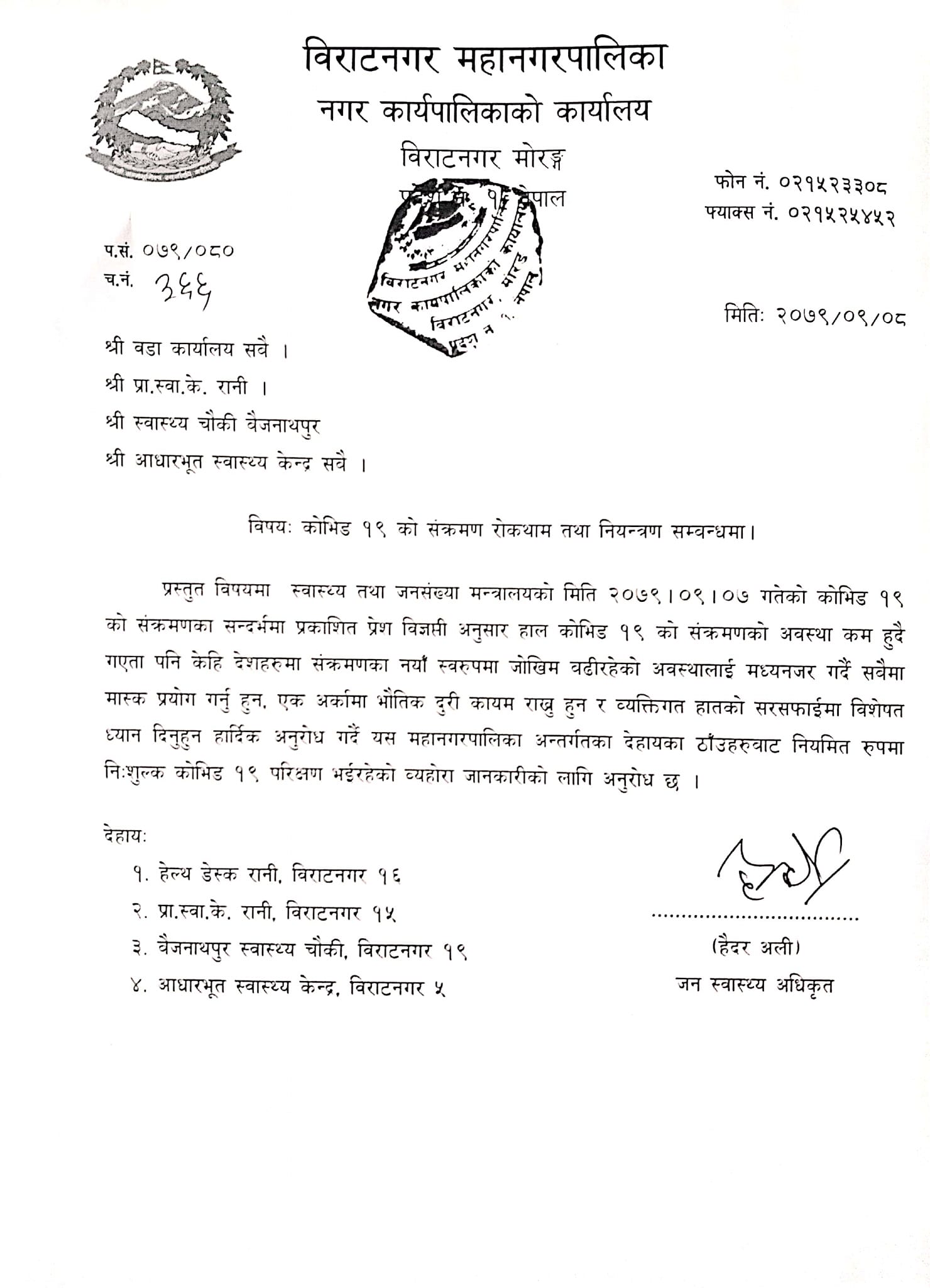विराटनगर,०९ पौष : विश्वका विभिन्न मुलुकमा कोभिड–१९ को तेस्रो लहर सुरु भएपछि विराटनगर महानगरले पनि सम्भावित संक्रमणको सामना गर्न तयारी सुरु गरेको छ ।