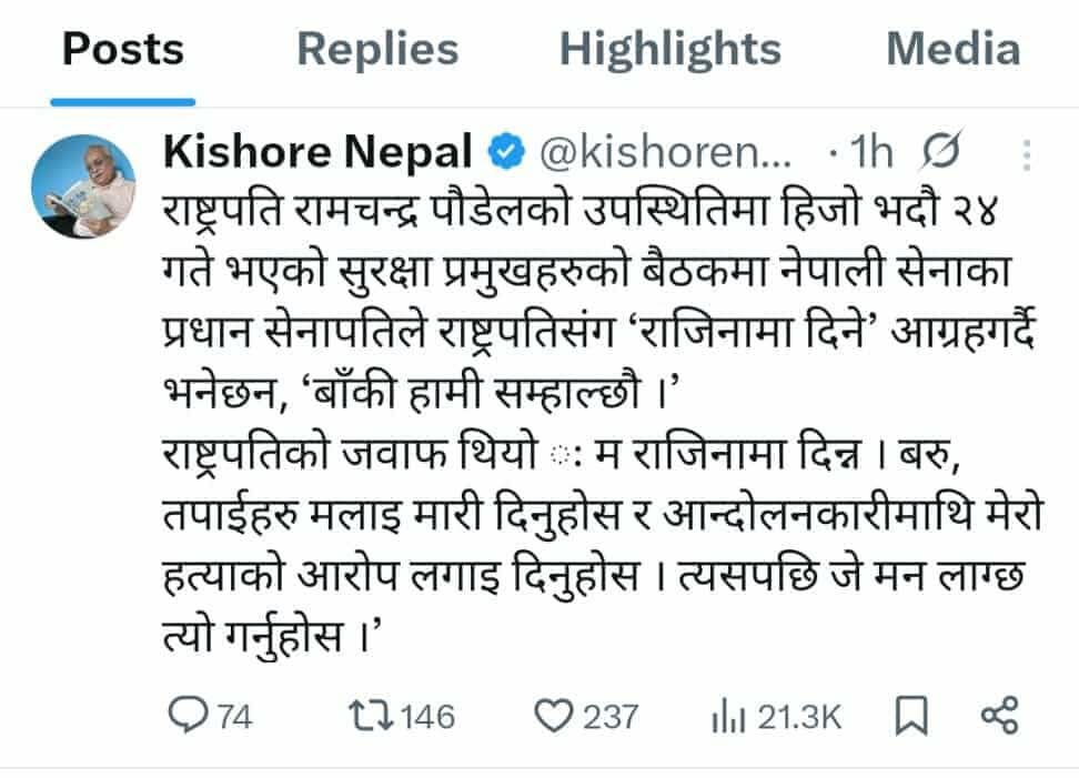 बुधबार सामाजिक सञ्जाल एक्समा उनले भदौ २४ गते सुरक्षा प्रमुखहरूको बैठकमा सेनापति सिग्देलले राष्ट्रपति समक्ष राजीनामा दिन आग्रह गरेको खुलासा गरेका हुन्।