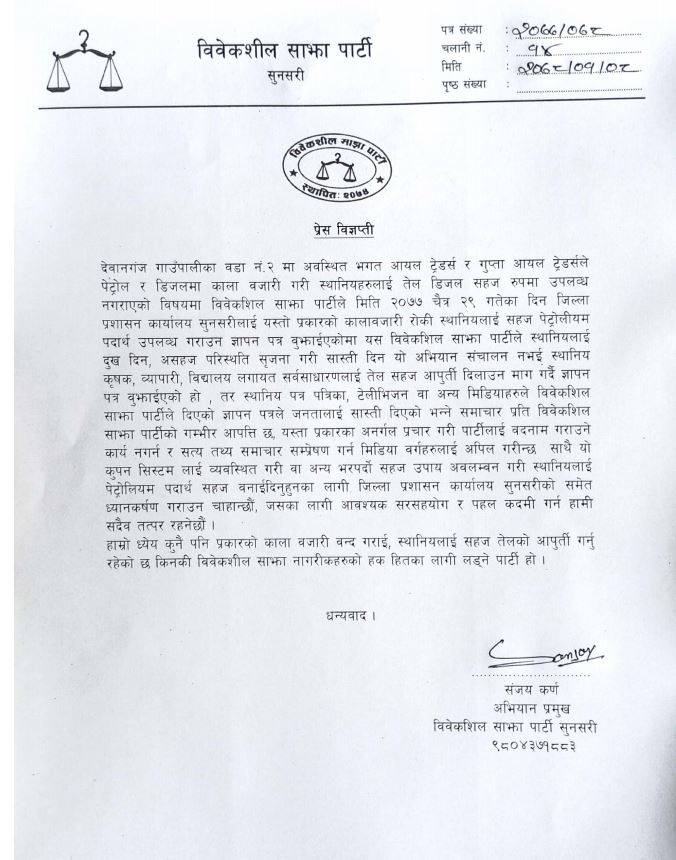 गत २६ चैतमा पेट्रोलियम पदार्थको कालोबजारी रोक्न माग गर्दै विवेकशील साझा पार्टीले जिल्ला प्रशासन कार्यालयमा ज्ञापनपत्र बुझाएको थियो । ती दुई पेट्रोल पम्पले पेट्रोल र डिजल कालोबजारी गरिरहेको जनाउँदै कारवाहीको मागसहित जिल्ला प्रशासन कार्यालय सुनसरीका सहायक प्रमुख जिल्ला अधिकारी महेशकुमार पोखरेललाई ज्ञापनपत्र बुझाएको थियो ।