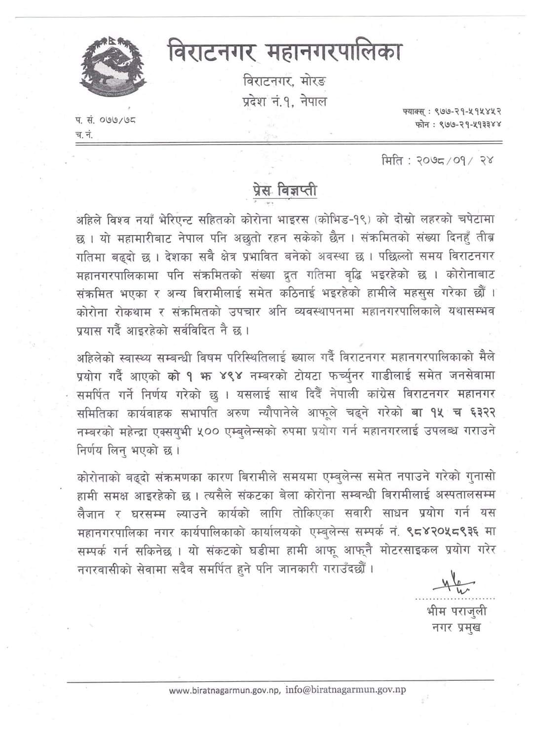 विराटनगर, २४ वैशाख । विराटनगर महानगरपालिकाका प्रमुख भीम पराजुलीले आफ्नो निजी गाडी एम्बुलेन्सका रूपमा प्रयोग गर्न दिएका छन् । शुक्रबार विज्ञप्ति जारी गर्दै मेयर पराजुलीले कोरोना सङ्क्रमित ओसार–पसार गर्नका लागि एम्बुलेन्सका रूपमा प्रयोग आफ्नो गाडी प्रयोग गर्न दिने निर्णय गरेको जनाए ।