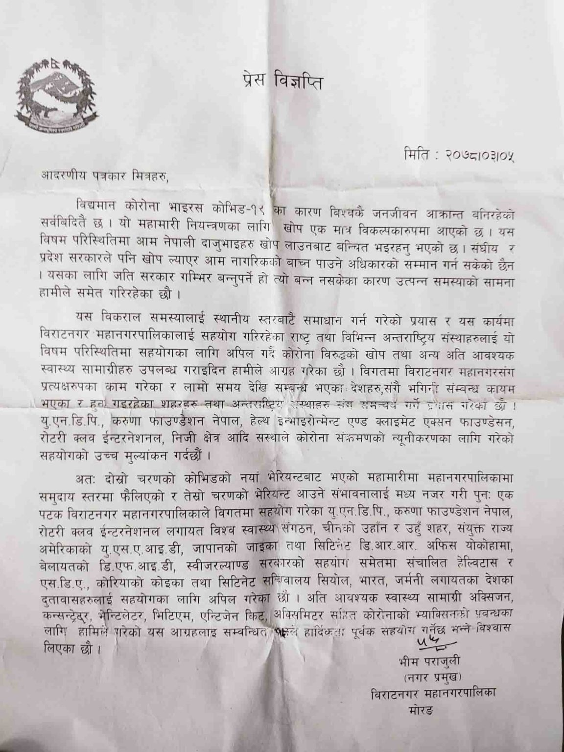 कोरोना भाइरसविरुद्धको खोपका लागि मेयर पराजुलीले विराटनगरलाई सहयोग गरिरहेका संस्था, देश तथा सहरहरुलाई आग्रह गरेका हुन् । विज्ञप्तीमा युएनडिपी, करुणा फाउन्डेसन नेपाल, युएसआईडी, जाइका लगायतका सस्था तथा चीनको वुहान सहरलाई समेत खोपको लागि आग्रह गरिएको उल्लेख छ ।
