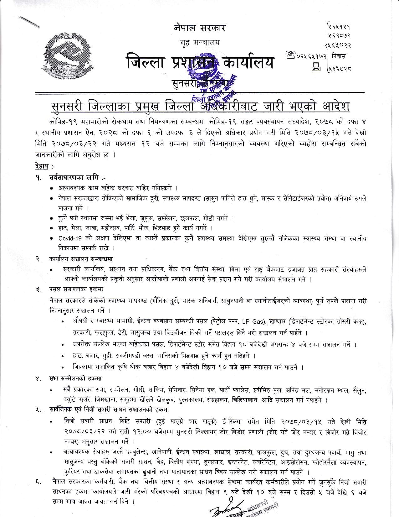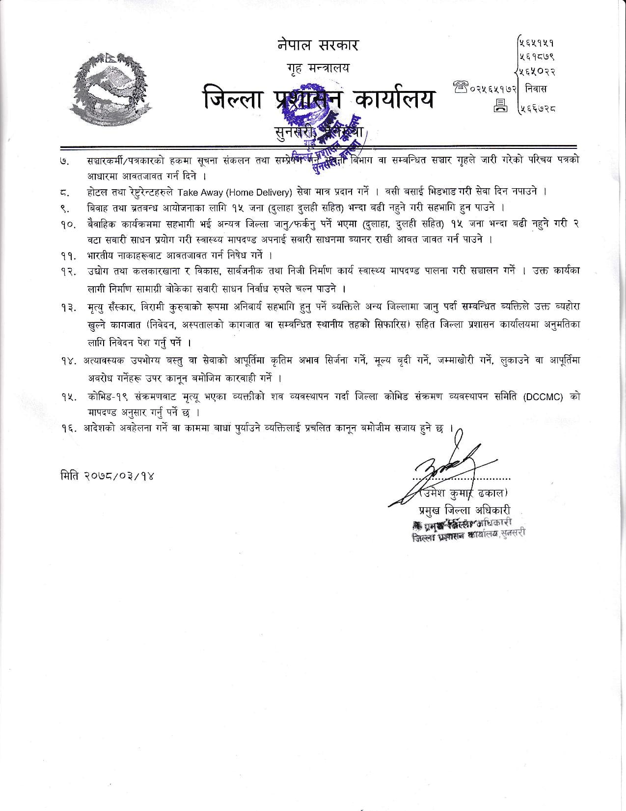 उनका अनुसार केही खुकुलो प्रावधानसहित जिल्लाभर निषेधाज्ञा थपिएको हो । अब सुनसरीमा सञ्चालित कृषि थोक बजार बिहान ४ बजेदेखि बिहान १० बजे सम्म सञ्चालन गर्न पाइने भएको छ । तथापि, ब्यूटि पार्लर, जिमखाना, समूहमा खेलिने खेलकुद, पुस्तकालय, संग्रहालय, चिडियाखान, आदि सञ्चालन गर्न पाइने छैन ।