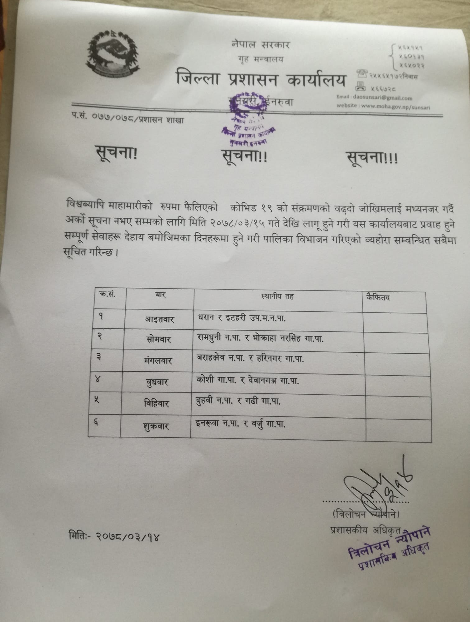 उनका अनुसार मङ्गलबारबाट लागू हुनेगरी प्रशासनले फरक बारमा फरक स्थानीय तहलाई सेवा प्रवाह गर्नेछ । जसअनुसार आइतबार धरान र इटहरी उपमहानगरपालिकालाई सेवा प्रवाह गरिने छ भने सोमबार रामधुनी नगरपालिका तथा भोक्राहा नरसिंह गाउँपालिकाले सेवा पाउने छन् ।